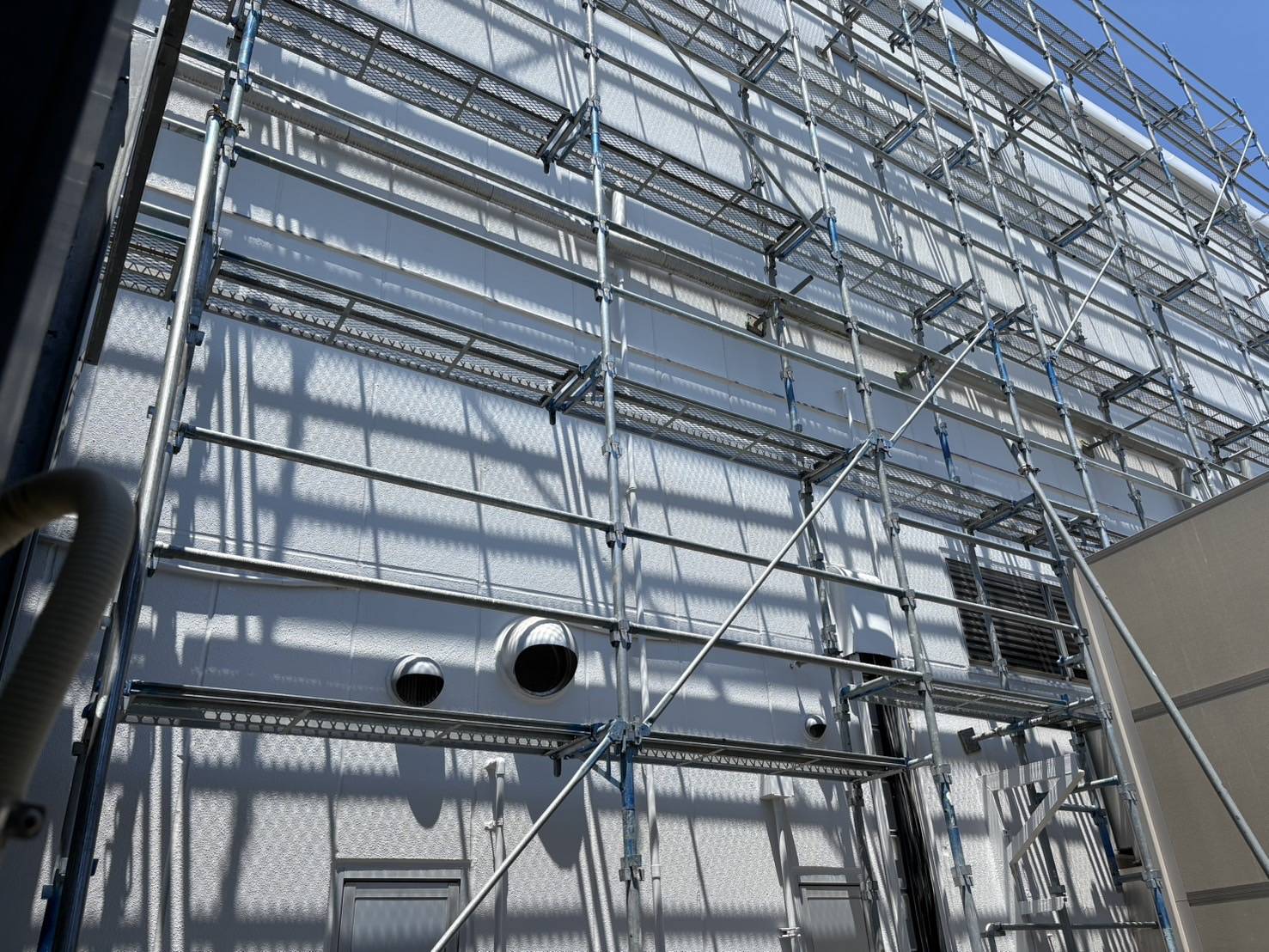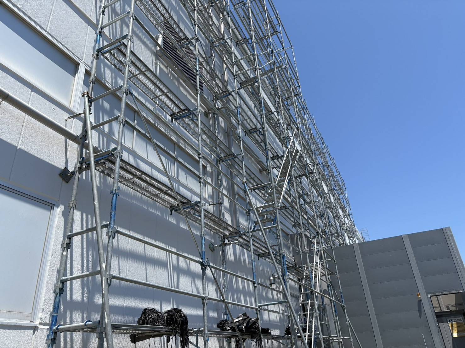 《現場》 榛原郡吉田町 空調ダクトや周囲を考慮し、設備を避けるように足場を組立。 作業員の昇降をスムーズにするため、ハシゴや作業床を適切に設置し、 高所作業のため、全面にわたり枠組足場を設置しました。