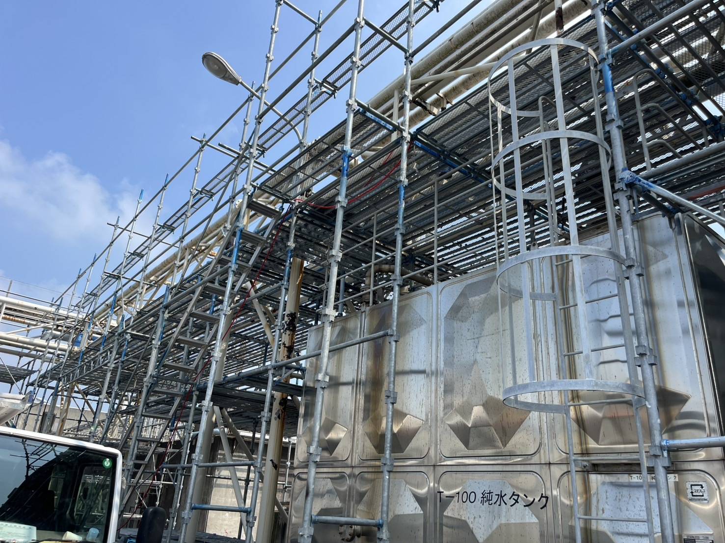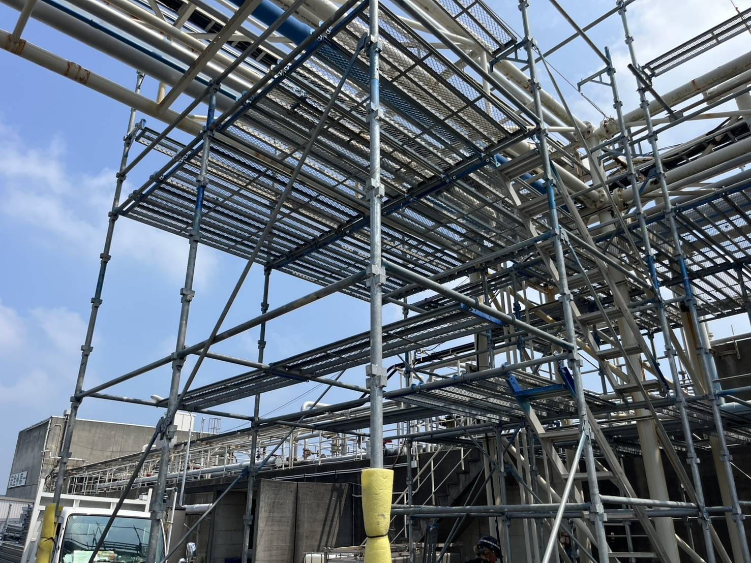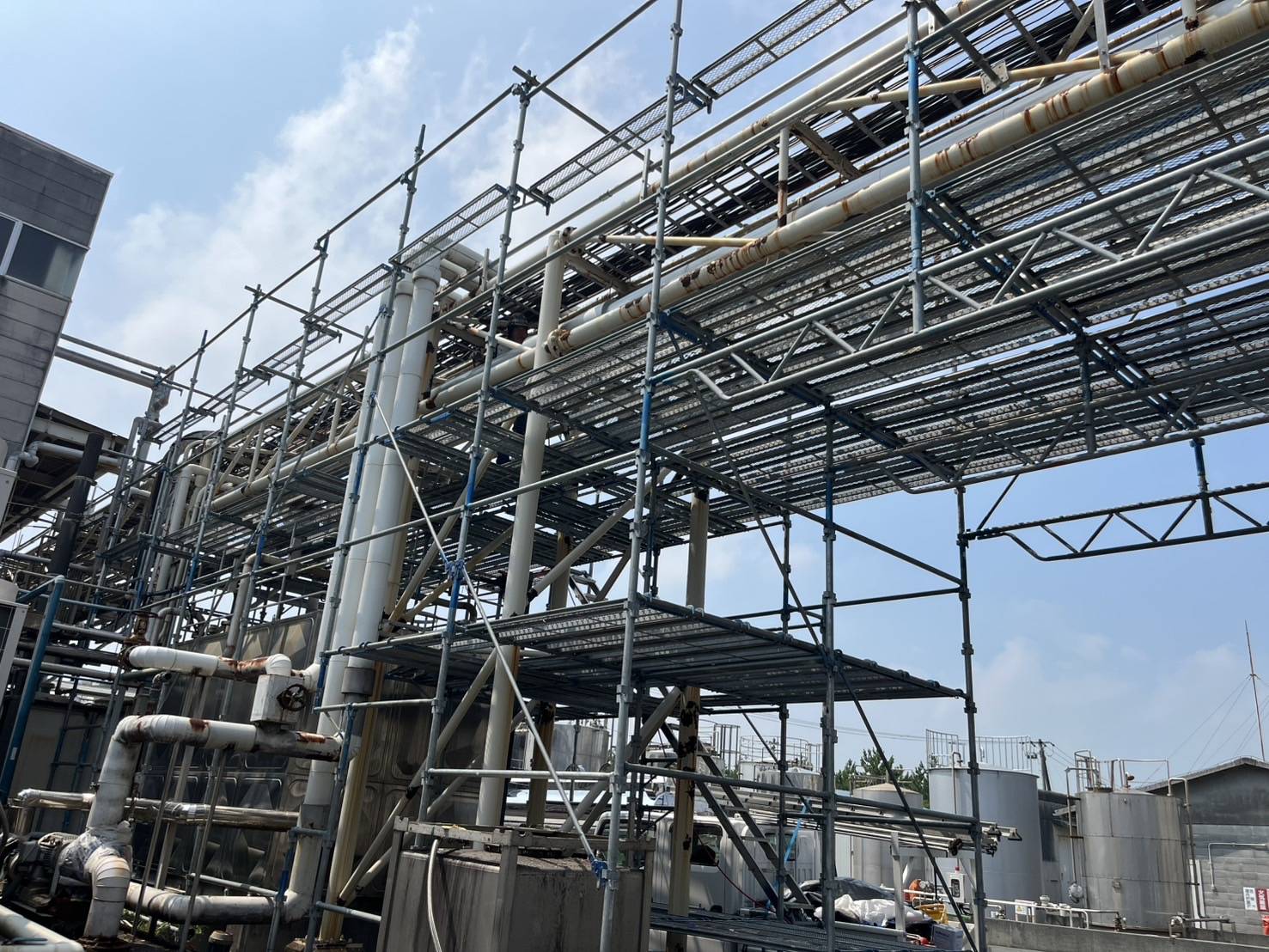 工場内の配管設備に沿った高所作業ため、頑丈で安全性の高い足場を設置しました。
