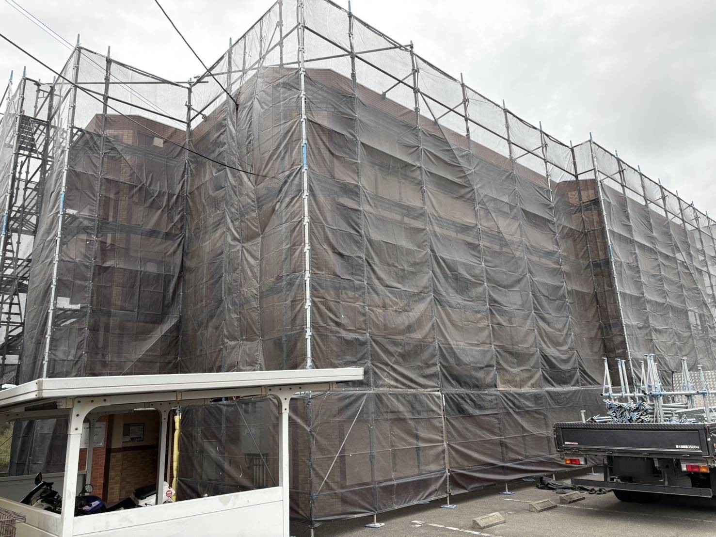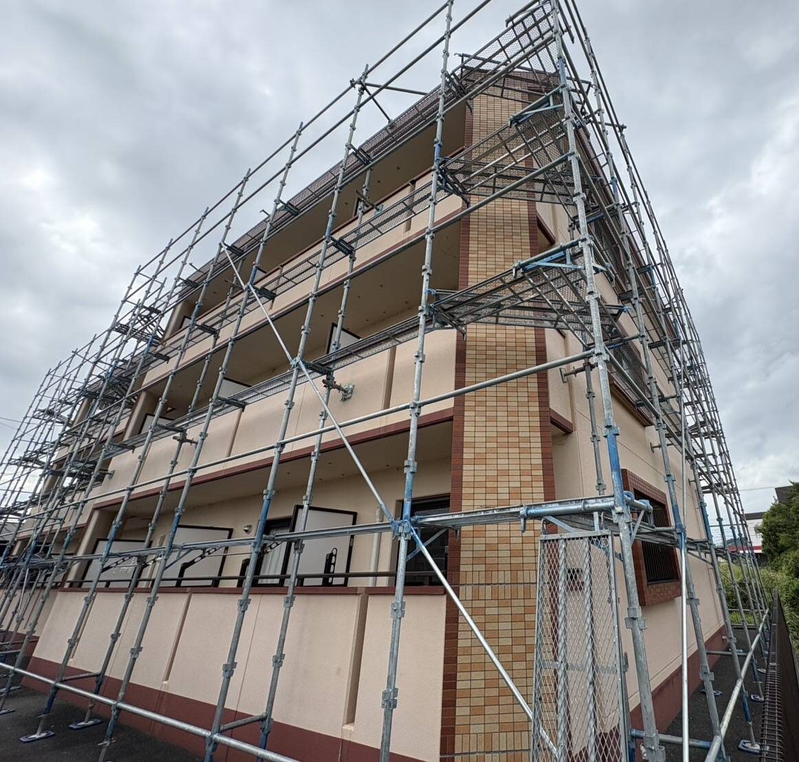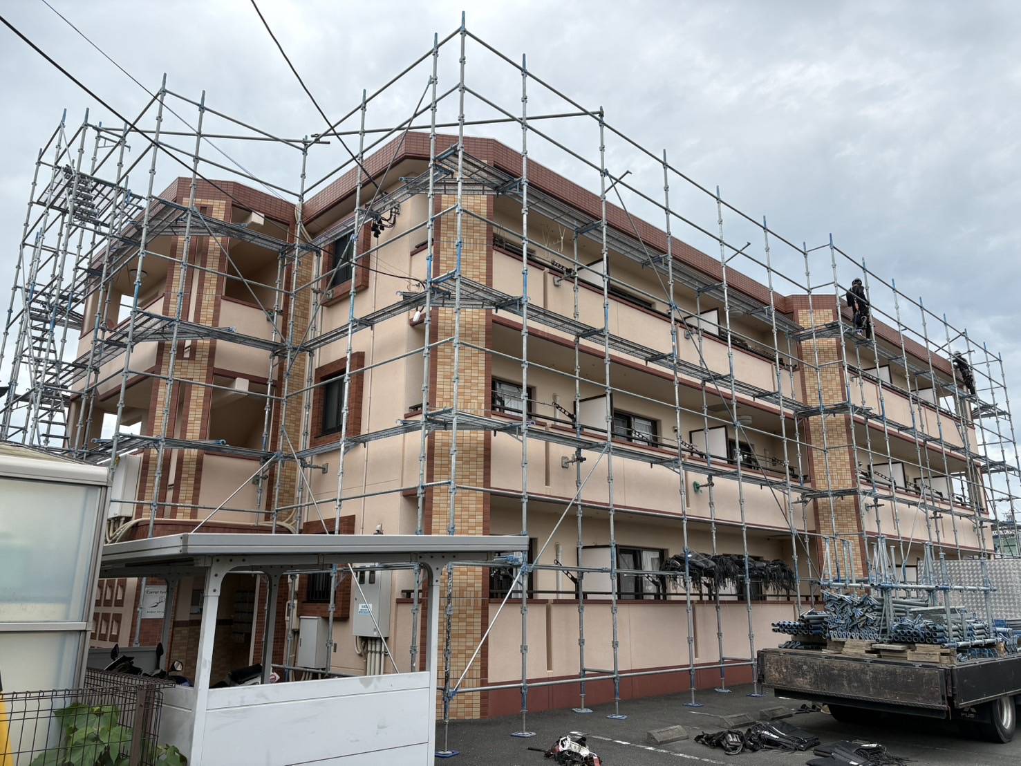《現場》 浜名区 外壁改修に伴い、枠組足場を設置しました。 安全性と作業効率を重視し、筋交いや控え材を適切に設置。 居住者皆様の生活に配慮し、出入口や通路の安全確保にも注意を払い、 安心・安全な足場施工を行いました。