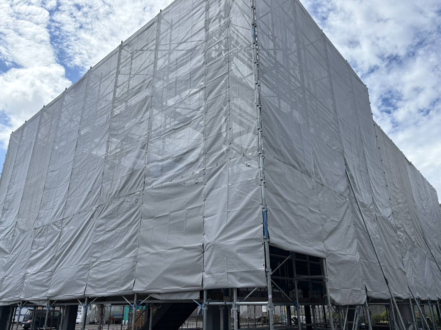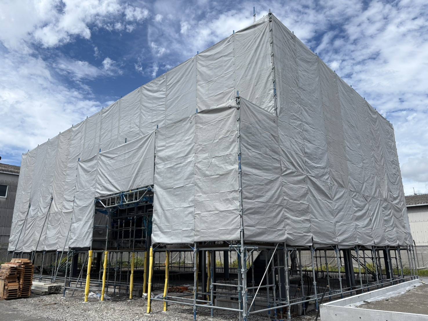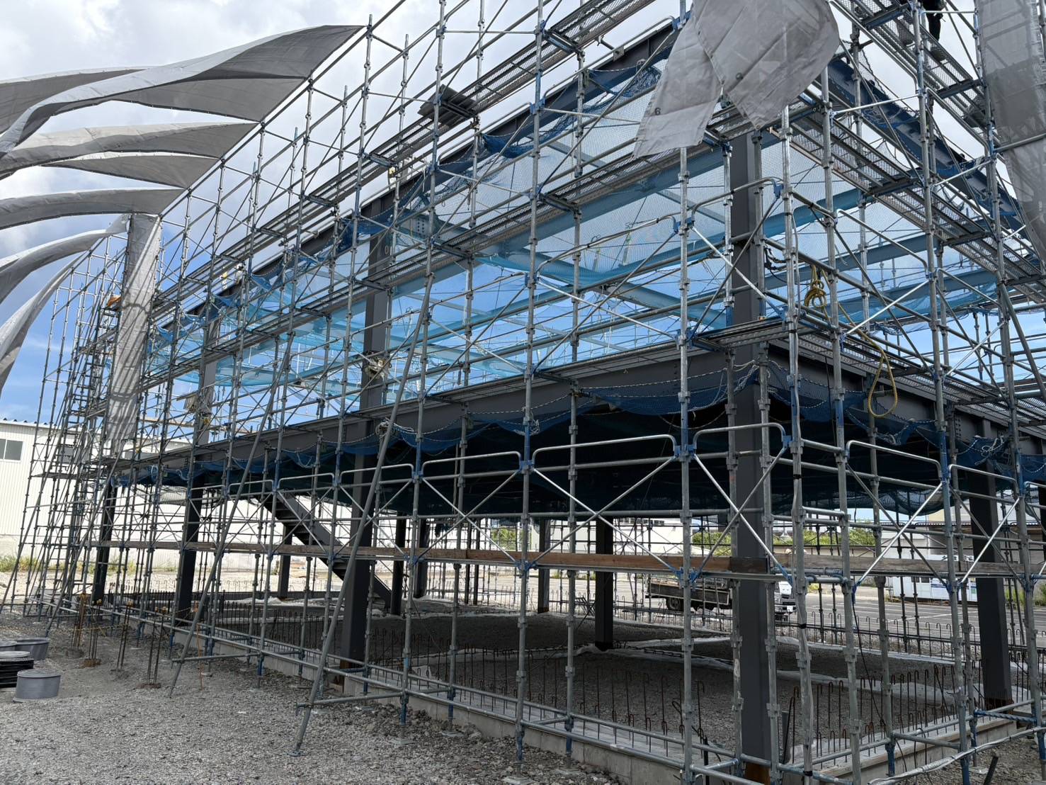 《現場》 藤枝市 当現場は鉄骨建方に伴う外部足場を施工。 作業安全性を確保するため、全面を囲うように枠組み足場の組立て・各階に安全ネットを設置しております。 構造全体をしっかりと支えつつ、 作業効率と安全管理を両立できるよう配慮した施工です。
