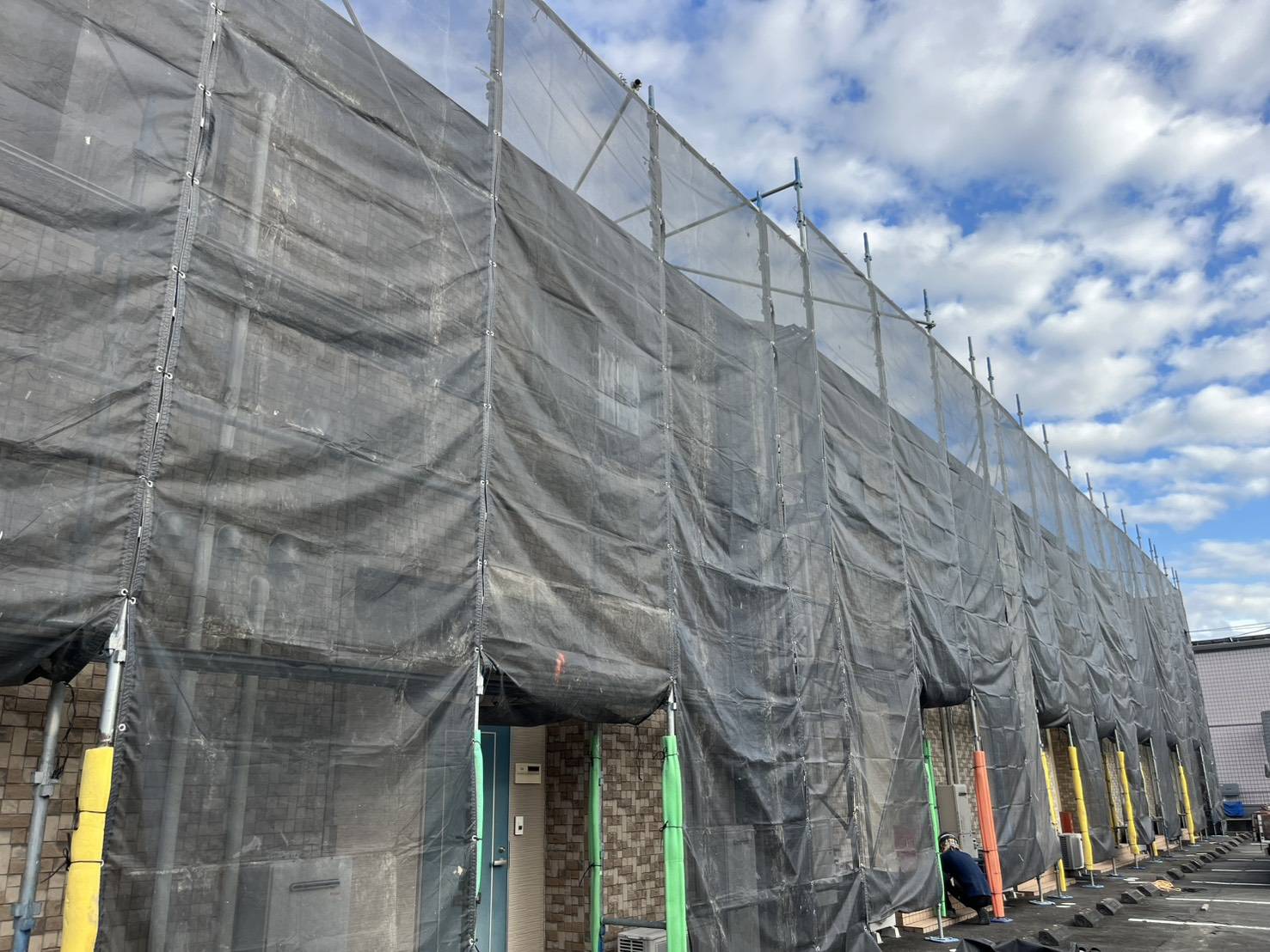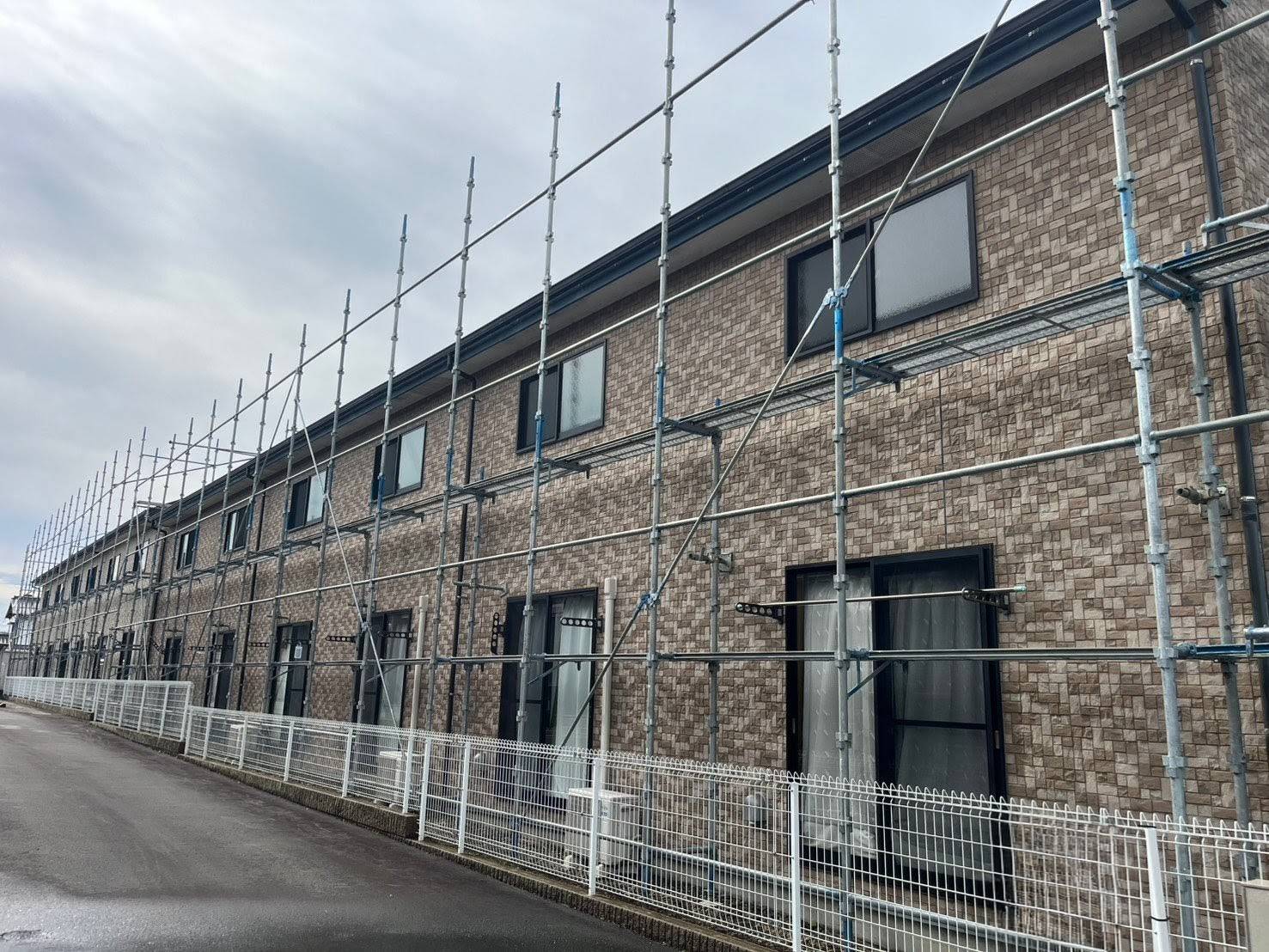 《現場》 掛川市 アパート・集合住宅の外壁工事に伴う足場を設置しました。 居住者様・周囲の方々への安全を大切にし、安心してご利用いただける 丁寧な足場施工を心掛けています。