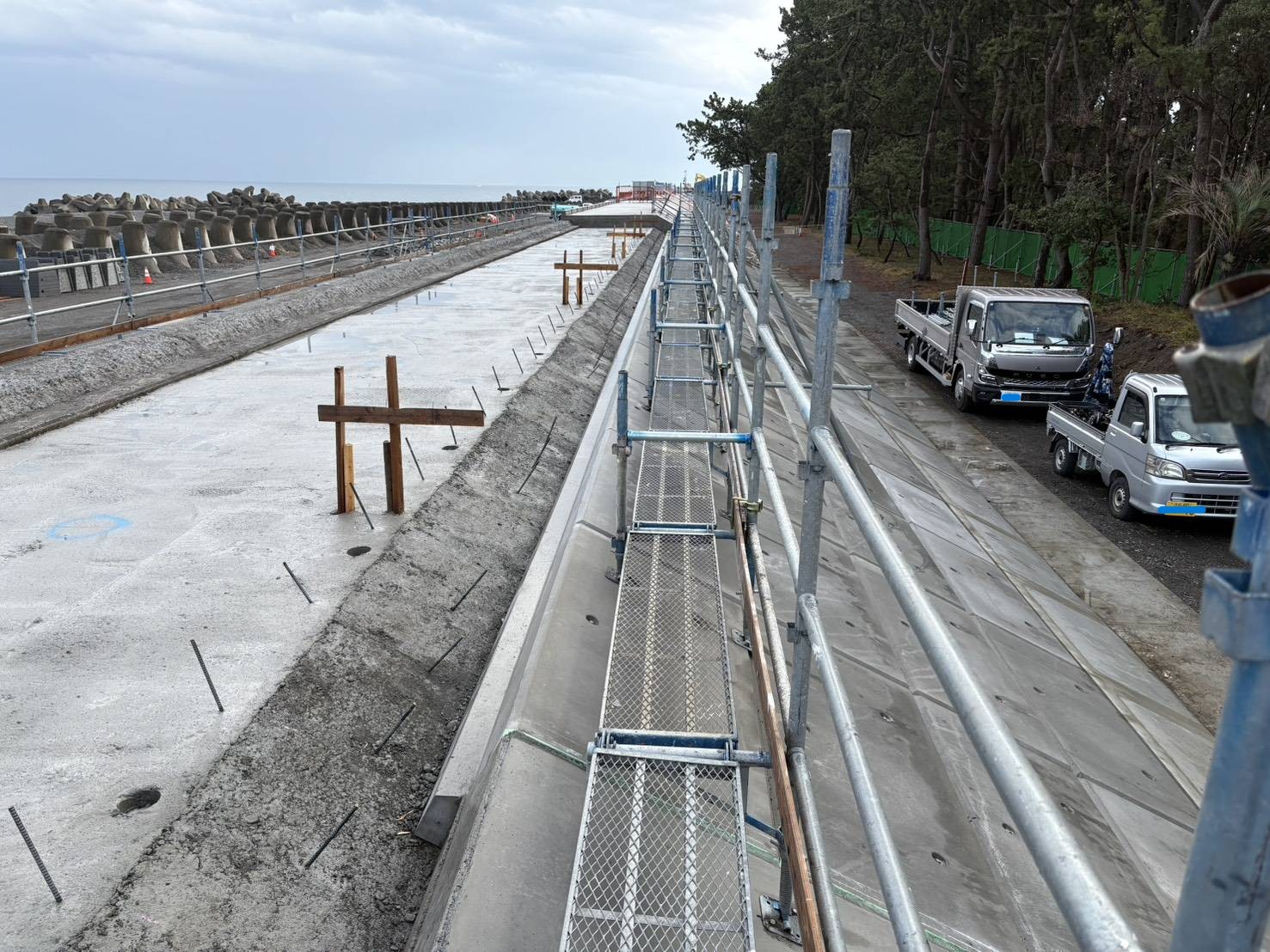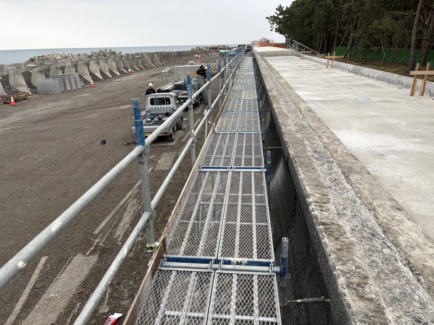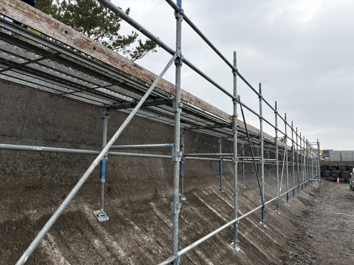 《現場》 焼津市 海岸・堤防などの傾斜部において、足場が組みにくい場所でも安全性を最優先にした仮設足場を施工しています。 現場条件に合わせた足場計画により、作業効率と安全確保の両立を実現した作業環境を提供させて頂きます。