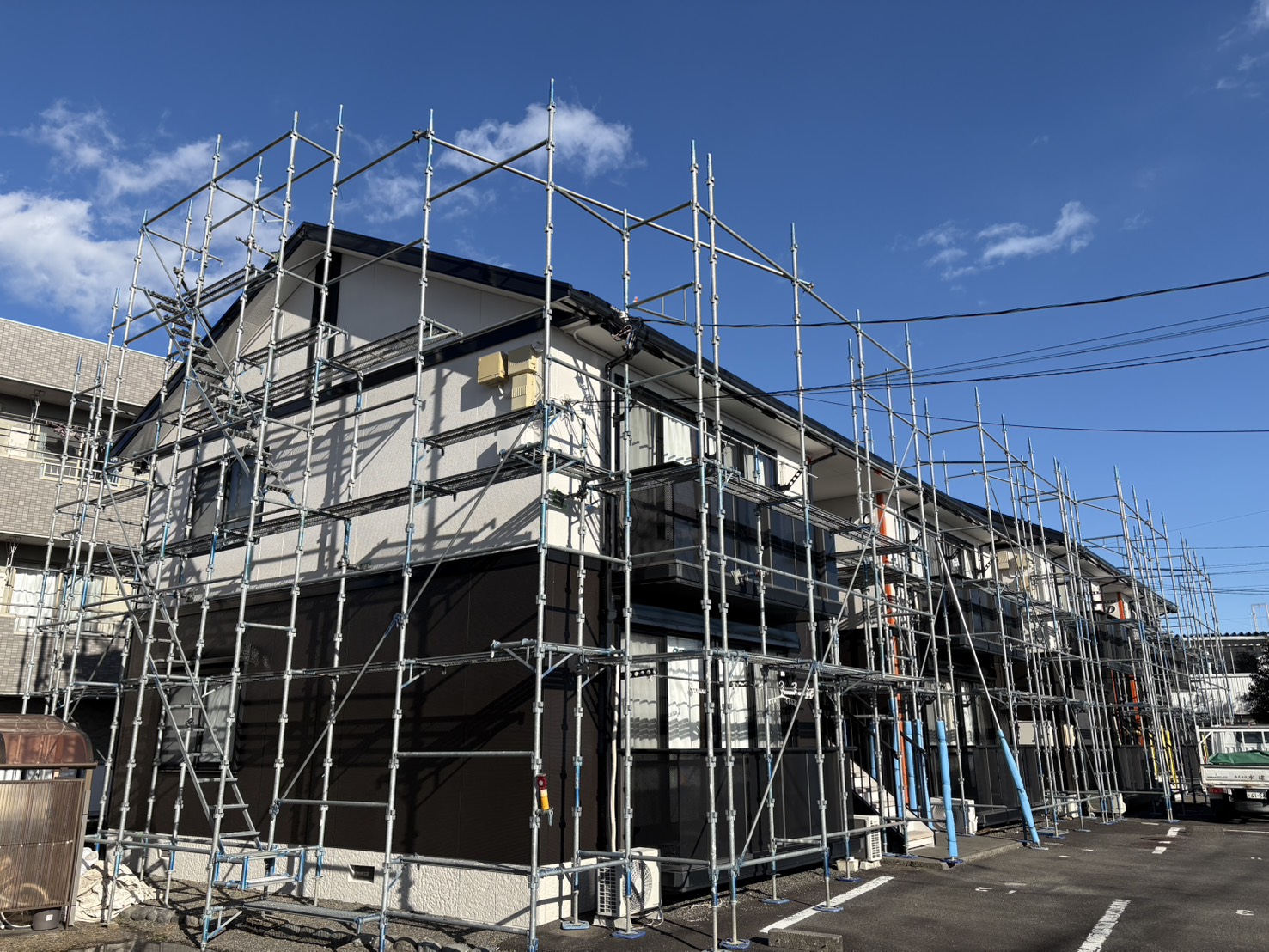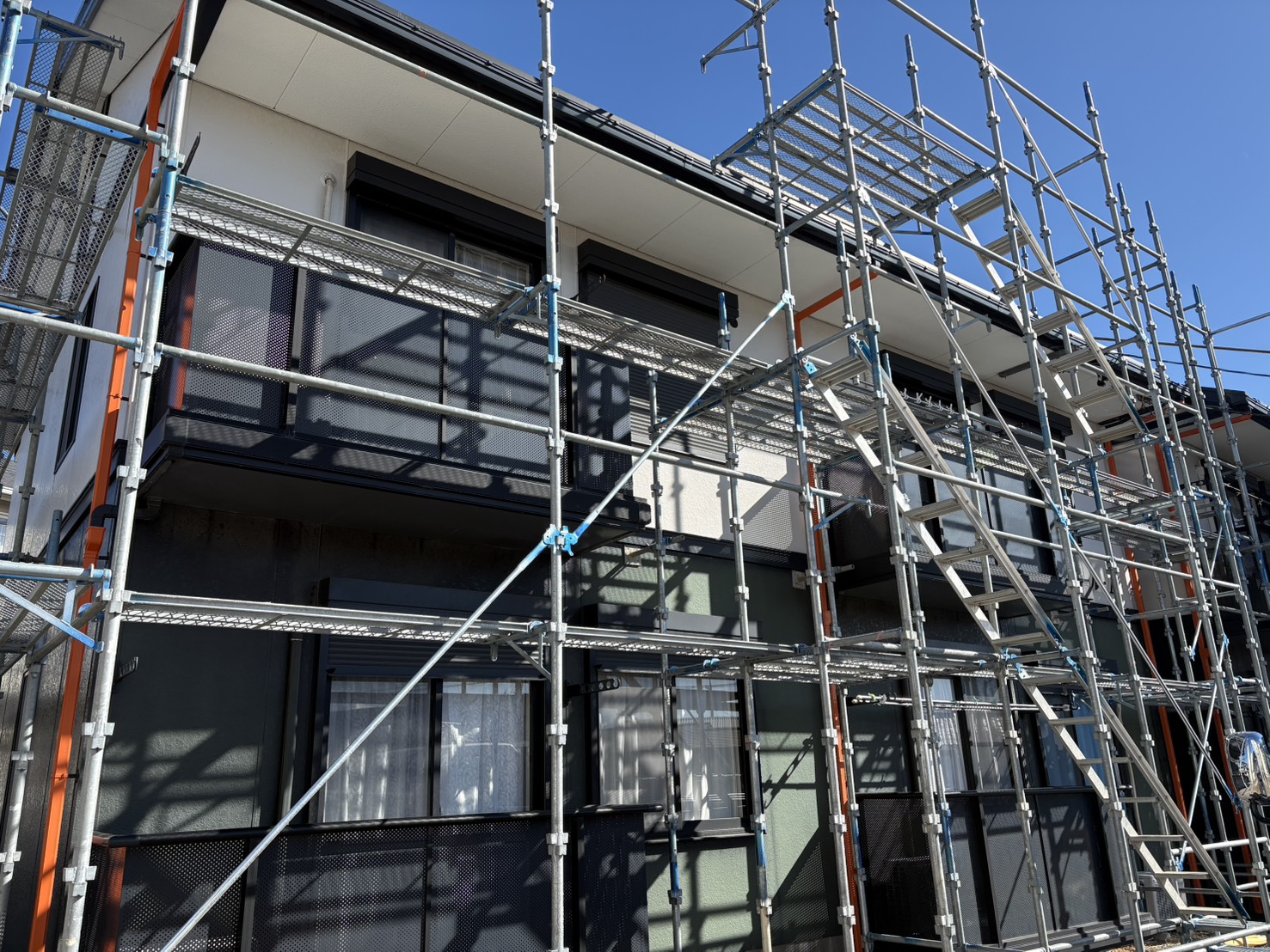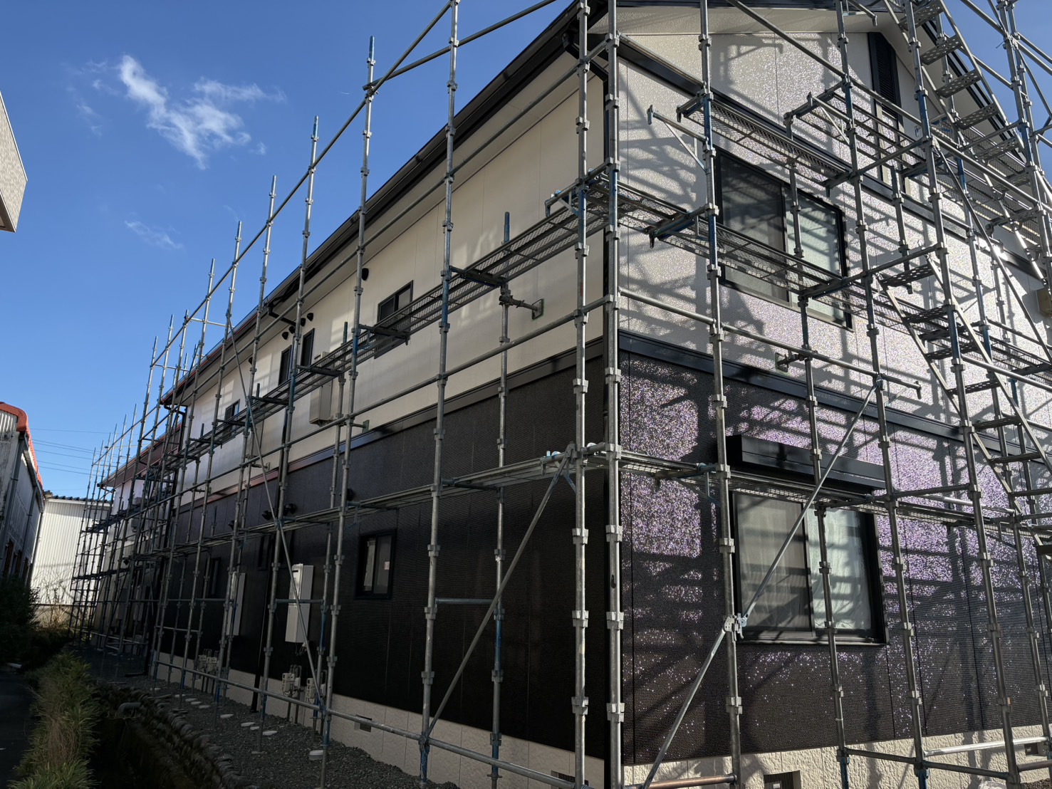 《現場》 島田市 足場は工事の安全と品質を支える重要な工程です。 当社では法令を尊守し、安全管理を徹底した足場施工を実施。 確実な組立・解体作業で、安心・信頼の現場づくりを支えます。