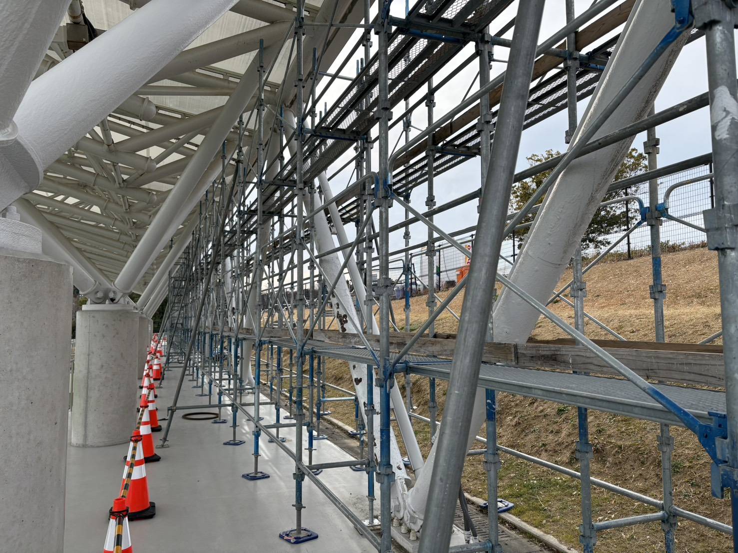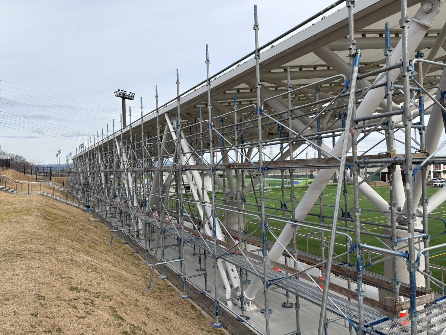 《現場》 浜名区 サッカー場 スタンド屋根の鉄骨工事に伴う足場施工を行いました。 スタジアムや大型施設など、様々な現場・施設の形状に合わせた足場を組立て、作業しやすい環境を整えると同時に安全第一で各職人の皆様方に安心して作業していただける 環境づくりをサポートさせて頂きます。